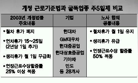 반면 CJ,신세계,롯데제과,대상 등 유통·식음료 업종은 근로기준법에 명시된 주5일제에 합의,굴뚝 업종과 묘한 대조를 보이고 있다.