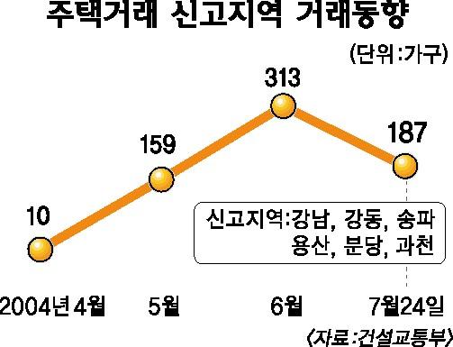 실제로 서울 강남 등 신고지역으로 지정된 곳에서는 아파트 거래가 70%이상 감소하고 값도 약세를 면치 못하고 있는 것으로 나타났다.신고지역으로 지정된 6곳의 주택거래 건수는 ▲강남구 140건▲송파구 218건▲강동구 122건▲성남시 분당구 140건(이상 4월26일 지정)▲용산구 34건▲과천시 15건(이상 5월28일 지정)등 모두 669건에 불과했다.