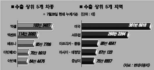 초기 12년간 수출한 100만대를 지난 한해동안 해냈고,전반 500만대에 22년이 걸린 반면 후반 500만대에는 불과 5년 반밖에 걸리지 않았다.