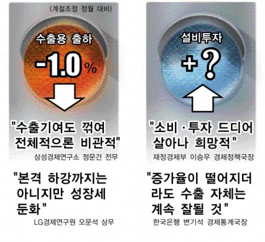 때문에 우리 경기가 짧은 회복기를 끝내고 본격적인 하강국면에 접어들었다는 우려와,아직은 예단하기 이르다는 신중론이 맞서고 있다.어느 쪽이든 성장세가 둔화됐다는 데에는 이견이 없다.