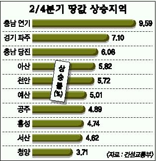 이미 투기지역으로 지정된 충남 연기군(9.59%)·아산시(5.82%)·천안시(5.72%)·공주시(4.89%)·계룡시(3.59%),경기 여주군(3.35%),서울 용산구(1.83%) 등 15개 시·군·구도 땅값 상승률이 물가상승률 이상으로 올랐다.
