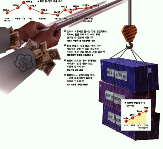 하반기 우리 경제의 또 하나의 ‘딜레마’는 환율이다.정부는 이미 ‘선택’을 했다.적극적인 개입을 통해 수출을 떠받치기로 한 것이다.수출기업,특히 중소기업들은 정부의 이같은 선택을 크게 지지한다.은근히 더 강한 개입을 바라고 있다.그러나 시장개입에 따른 득(得)보다 실(失)이 더 많다는 반대의견도 적지 않다.중앙은행은 물론 국책연구기관까지 정부의 집요한 환율방어가 내수 위축을 심화시켜 경기 양극화를 더 자극한다고 우려한다.