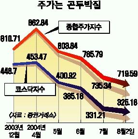 이 때문에 우리나라 등 아시아 주식시장이 된서리를 맞았다.종합주가지수는 지난주말보다 2.14%(15.75포인트)나 떨어진 719.59로 마감,연중 최저치(5월17일 728.98)를 갈아치웠다.일본(0.91%) 타이완(1.29%)보다 하락폭이 훨씬 크다.코스닥지수도 325.18로 사상 최저 수준으로 추락했다.