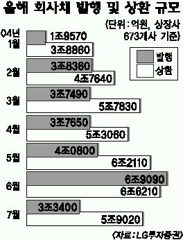 지난해 같은 기간보다 발행액(31조 6860억원)은 13% 줄고,상환액(35조 7610억원)은 8% 가량 늘어난 것이다.이는 기업들이 빚을 내서라도 투자하는 예년과 달리 올해는 투자보다 빚을 먼저 갚고 있다는 것을 뜻한다.
