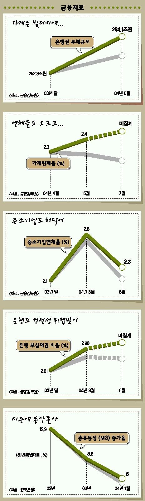 금융감독원에 따르면 은행권의 가계부채는 6월 말 현재 264조 1000억원으로 지난해 말(254조 5000억원)보다 더 늘었다.빚을 갚고 또 갚아도 줄지 않는다는 얘기다.금융비용 부담 때문이다.이에 따라 도시근로자의 부채상환비율(부채상환액/처분가능소득)이 2002년 18.7%에서 지난 1·4분기에 25.9%로 뛰어올랐다.