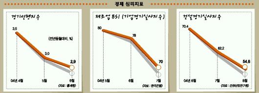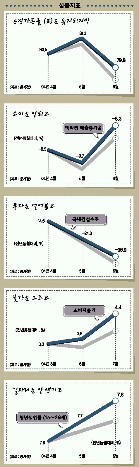 여기다 여의치 않은 개인의 호주머니 사정도 각종 실물지표 추이에 직접적인 영향을 주고 있다.6월 산업활동동향에 따르면 한마디로 소비와 투자는 전보다 나아지는 신호를 찾을 수가 없다.도·소매판매가 플러스로 반전되긴 했지만,소비의 핵심지표인 백화점 매출 증가율은 전년동월대비 마이너스 5.3%, 설비투자의 대표적인 지표 가운데 하나인 건설수주도 마이너스 36.9%를 각각 기록했다.이런 가운데 고유가 등의 여파로 물가는 갈수록 치솟고,고용 사정도 나아지지 않고 있다.