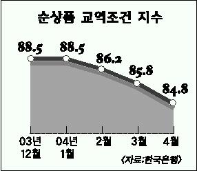 순상품교역조건지수는 1단위 수출대금으로 수입할 수 있는 물량을 의미하며,이 지수가 하락하면 똑같은 양을 수출해도 구입할 수 있는 수입품의 양이 줄어들어 실질구매력도 떨어진다.순상품교역조건지수가 계속 하락하는 것은 수출단가지수는 제자리걸음인데 유가 급등으로 수입단가지수가 지난해 12월 99.5에서 올 4월 106.9로 올랐기 때문이다.