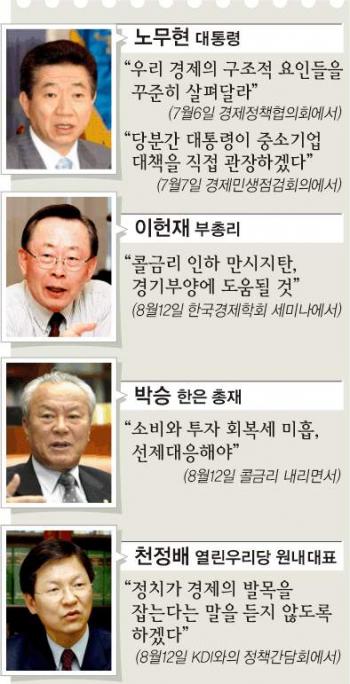 위기론을 부인하는 데 급급했던 정부가 경제가 어렵다는 것을 인정하고 총력대응 체제로 전환했다.금리를 전격 인하하고,부동산정책의 속도조절에 나섰다.힘의 무게추도 학자 출신 관료와 ‘386참모’ 중심에서 이헌재 경제부총리 등 정통 경제관료로 옮겨가고 있다.