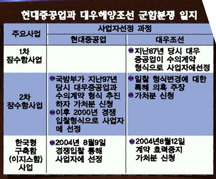 대우해양조선은 최근 해군전력증강 사업으로 추진돼온 이지스함사업(KDX-Ⅲ)의 사업자로 현대중공업이 선정되자 12일 서울중앙지법에 가처분 신청을 내며 강력 반발하고 나섰다.이들 양사는 지난 97년에도 잠수함사업을 놓고 법정 공방을 벌인 바 있어 군함 사업권을 둘러싼 이들의 해묵은 갈등이 재연된 것이다.