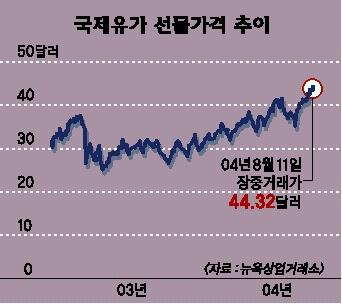 11일 뉴욕상품거래소(NYMEX)에서 9월 인도분 서부텍사스중질유(WTI)는 전날보다 배럴당 28센트 오른 44.80달러에 마감돼 최고가인 44.84달러에 근접했다.12일에도 상승세가 이어져 한때 사상 최고치인 배럴당 45.45달러를 기록하는 등 45달러 이상에서 거래가 이뤄지고 있다.원유시장은 고유가에다 뉴스에 매우 민감하고 취약한 장이 됐다.