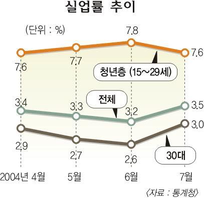 19일 통계청이 발표한 ‘7월 고용동향’에 따르면 지난달 실업자는 전월보다 5만 1000명이 늘어난 81만 4000명이며,실업률도 전월보다 0.3%포인트가 오른 3.5%를 기록했다.이는 지난 2월(3.9%) 이후 5개월 만에 상승세로 반전한 것이다.계절적인 요인을 제거한 계절조정 실업률은 3.6%로 올라 지난해 11월(3.6%) 이후 최고치였다.