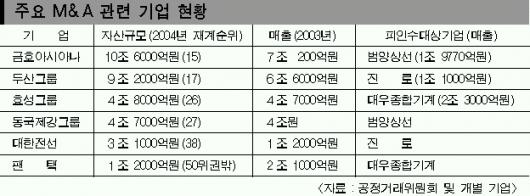 국내 기업들이 M&A시장에 사활을 걸고 있다.M&A가 사업다각화나 기업의 몸집 불리기 등 중장기 전략과 맞닿아 있기 때문이다.특히 최근 M&A시장에 나온 기업들은 대부분 1조∼2조원 안팎의 대형기업이어서 올해 말이나 내년 초 인수작업이 마무리되면 재계 순위가 한차례 요동칠 것으로 보인다.몇몇 기업은 인수 성사를 위해 총수가 직접 뛰고 있다.