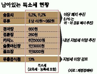 그런가 하면 야당은 승용차와 기름에 붙는 특소세도 폐지하는 방안을 추진 중이다.한나라당 이한구 정책위의장은 “사치품 특소세는 폐지하고 중산층이 쓰는 자동차·유류 특소세는 그대로 둔 것은 잘못”이라며 “아예 특소세를 모두 폐지하든지 우선순위를 조정해야 한다.”고 주장했다.