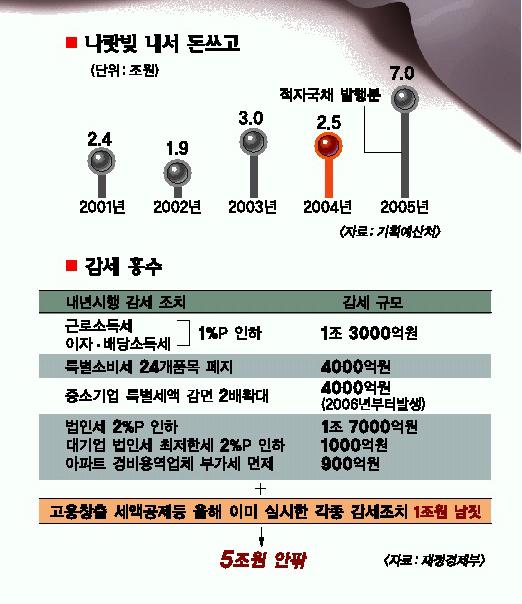 상황이 이런데도 당·정·청은 ‘정책조합’이라는 명분 아래 각종 ‘카드’를 앞다퉈 쓰고 있다.일자리창출 세액공제 등 고용과 투자에 국한됐던 감세조치는 근로소득세 인하 등 전방위로 확대됐다.총 5조원 안팎의 세수 감소가 예상된다.국책사업 등 재정지출도 대폭 늘려잡았다.모자란 돈은 빚(적자국채)을 내기로 했다.내년에 발행키로 한 적자국채는 7조원.올해(2조 5000억원)의 세 배에 이른다.국내총생산(GDP,내년 800조원 예상)의 1%에 육박해 ‘균형재정’을 위협한다.“설사 내년에 경기가 더 나빠지더라도 아직은 재정이 건전해 (재정지출 확대 등을 통해)대응할 수 있다.”던 재경부의 한달 전 주장이 무색해졌다.