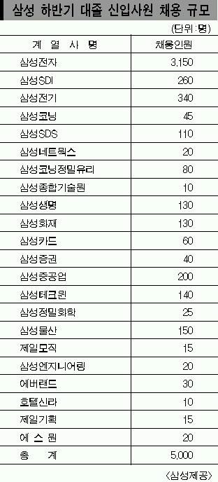 계열사별 채용 규모를 보면 신규투자로 인력충원 수요가 많은 삼성전자가 3150명으로 가장 많이 뽑는다.이어 삼성전기 340명,삼성SDI 260명,삼성중공업 200명,삼성물산 150명,삼성테크윈 140명,삼성생명 130명,삼성화재 130명,삼성SDS 110명 순이다.
