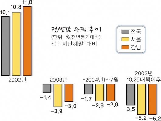 전세값 하락세는 적잖이 심각하다.올 1∼7월 가격이 지난해 말에 비해 전국(1.7%)·강남(2.9%) 할 것 없이 크게 떨어졌다.지난해 ‘10·29대책 이후’와 비교하면 3∼5%나 하락했다.재경부 조성익 정책조정국장은 “집값 폭등세는 확실히 꺾였다.”면서 “그러나 추가적인 집값 하락은 담보가치 하락에 따른 부실채권 양산 등을 야기해 바람직하지 않다.”고 재차 강조했다.이어 “올 하반기에 집값이 2%가량 추가하락한다는 분석이 있으나 정부는 그렇게 보지 않는다.”며 “집값의 하방경직성과 이사철 수요 등을 감안할 때 집값은 현 수준에서 미세한 등락을 이어갈 것”이라고 관측했다.