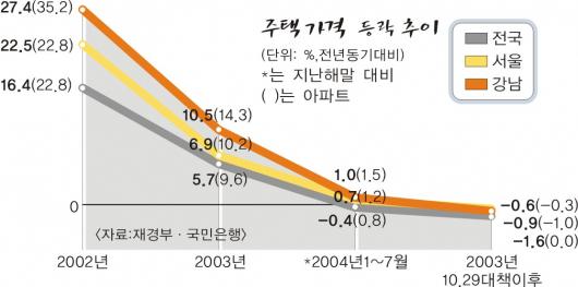 재정경제부가 국민은행 자료를 토대로 분석한 ‘주택시장 동향’에 따르면 올 1월부터 7월까지 전국 주택가격은 지난해 말에 비해 0.4% 하락했다.그러나 주된 투기대상인 아파트값만 따지면 같은 기간 0.8% 올라 불안한 양상을 보이고 있다.특히 서울 전역(1.2%)과 강남(1.5%) 아파트값은 여전히 상승세다.강경 일변도로 치닫던 정부의 부동산대책이 올들어 다소 느슨해진 영향으로 풀이된다.