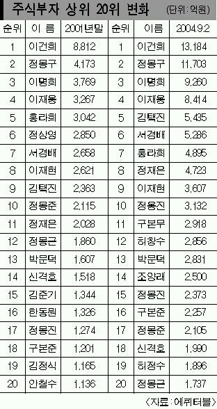 20위권에 새로 진입한 부자는 정용진 신세계 부사장과 조양래 한국타이어 회장이다.반면 정상영 KCC 명예회장과 김준기 동부그룹 회장 등 재벌총수와 한동원 정소프트 대표,김정식 대덕전자 회장,안철수 안철수연구소 대표 등은 주식 부호 대열에서 한걸음 물러났다.이 중 벤처기업 경영자가 3명이나 돼 벤처의 부진을 반영했다.