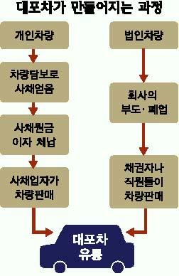 대포차가 만들어지는 통로는 통상 두가지.자동차의 주인으로 이름이 올라 있는 기업체는 부도나 폐업신고로 이미 존재하지 않지만,채권자나 봉급과 퇴직금 등을 받지 못한 기업체 직원들이 회사명의 자동차를 무단으로 다른 사람에게 헐값에 넘겨 버린다.