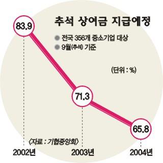 중소기업협동조합중앙회가 전국 356개 중소기업을 대상으로 추석자금 실태를 조사한 결과,추석 상여금을 지급할 예정인 기업은 65.8%로 나타났다.3년째 줄고 있다.2002년 같은 조사에서는 83.9%,지난해에는 71.3%가 추석상여금 지급의사를 밝혔었다.그나마 “아예 지급하지 못한다.”고 밝힌 기업은 10.6%로 지난해(13.2%)보다 조금 줄었지만 “아직 결정하지 못했다.”고 대답한 기업은 15.5%에서 23.6%로 늘어 요즘 중소 기업 사장들의 자금고민을 쉽게 읽을 수 있다.상여금을 지급할 계획인 업체들도 액수를 줄이고 있다.지난해에는 월급의 51∼100%를 지급하겠다는 기업(53.0%)이 가장 많았으나 올해는 50% 이하인 기업이 절반이 넘는 53.2%나 된다.연휴기간은 4일(62.5%)이 대부분을 차지했다.