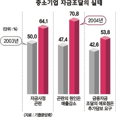 올 추석을 앞두고 중소기업들이 ‘돈 가뭄’에 목이 타고 있다.지난해보다 더 심하다는 게 현장의 한결같은 목소리다.자금 사정이 악화돼 보너스를 지급하겠다는 회사도 줄었고,은행을 찾아도 대출은 고사하고 도리어 보험(방카슈랑스·은행에서 취급하는 보험상품)에 가입하라는 권유에 시달려야 한다고 볼멘소리다.