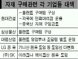 현대건설과 삼성물산은 최근 플랜트 전문 구매팀 구성에 나섰다.비중이 커진 플랜트의 공사 원가를 낮추기 위해서는 전문팀을 운용할 필요가 생겼기 때문이다.인력 수급을 위해 필리핀,태국,인도,방글라데시,네팔 등에 15개 인력대리점을 운용하고 있다.현대건설은 플랜트 부문의 인원보강도 계획하고 있다.중국 자재를 구입하는 방안도 추진하고 있다.현대건설 김호상 상무는 “국내에서는 자재부를 지원부서쯤으로 생각하지만,선진국에서는 원가절감에서 품질관리까지도 담당케 하고 있다.”면서 “자재부의 기능을 확충,가격경쟁력과 품질관리에 보탬이 되도록 운용할 계획”이라고 말했다.