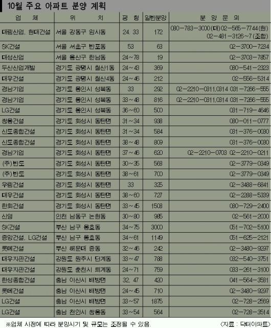 경인지역에서는 화성 동탄 1단계가 단연 주목의 대상이다.대우건설,우림건설,월드건설,신도종합건설,쌍용건설,경남기업,㈜반도,한화건설 등 8개 업체가 모두 6456가구를 10월 중순 분양한다.당초 10월 1일 모델하우스를 열 계획이었으나 추석연휴 때문에 늦어지게 됐다.동탄신도시 1단계 분양성공여부에 따라 부동산 시장의 회복여부나 건설경기 연착륙을 알 수 있는 가늠자가 될 것으로 보인다.