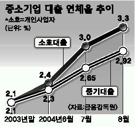 22일 재정경제부와 금융권에 따르면 은행권이 중소기업에 빌려준 돈(잔액기준)은 8월말 현재 약 250조원이다.가계대출 규모(269조원)와 맞먹는다.이 가운데 사실상 떼인 돈은 7조원이 넘는다.금융감독원에 따르면 은행권의 중소기업 대출 연체율이 8월 2.92%로 한달 사이 0.27%포인트나 올랐다.경기회복 지연으로 제때 대출금을 갚지 못하는 중소기업들이 늘고 있는 탓이다.특히 ‘소호대출’로 불리는 개인사업자 대출 연체율은 3.3%로 급등했다.내수침체의 직격탄을 맞은 음식·숙박업 등에 소호대출이 집중됐기 때문이다.경영난을 견디지 못하고 중소기업들이 쓰러지게 되면 은행 대출금 부실로 이어져 ‘도미노 부실’을 초래하게 된다.소호대출을 공격적으로 취급한 국민·우리은행 등이 바짝 긴장하고 있는 것은 이 때문이다.