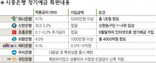 한미은행 합병을 목전에 두고 있는 씨티은행은 다른 은행들보다 앞서 특판상품을 팔아왔다.5000만∼5억원의 1년 정기예금 가입자에게 이자를 연 4.1% 적용한다.우리은행은 현재 진행중인 전산망 교체가 끝나는 대로 다음달 특판예금 판매를 고려하고 있다.자산규모 1위인 국민은행은 특판상품 출시계획은 없지만 상황에 따라 지점장 전결금리를 신축적으로 운용할 예정이다.