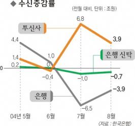 지난달 한은의 콜금리 목표 인하 이후 가속화하고 있는 은행예금의 투신권 이탈도 이런 움직임을 부추기고 있다.투신권 단기자금인 MMF(머니마켓펀드) 잔액은 지난 20일 현재 59조 9930억원으로 콜금리 목표 인하 직전인 지난달 10일(55조 1730억원)에 비해 무려 5조 가까이 늘어났다.이 가운데 상당수가 은행에서 빠져나온 것으로 추산된다.