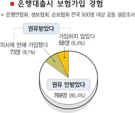 은행연합회와 생명보험협회,손해보험협회가 최근 전국 방카슈랑스 가입자 900명을 대상으로 실시해 23일 발표한 조사결과에 따르면 응답자의 14.6%인 131명이 은행대출 과정에서 보험가입을 권유받았던 것으로 나타났다.20명 중 3명꼴이다.이 가운데 자기 의사에 반해 어쩔 수 없이 보험에 들었다는 사람은 절반이 넘는 73명(55.7%)에 달했다.나머지 58명(44.3%)은 가입을 거부했다.