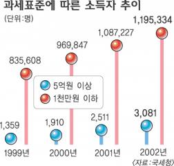 과표가 5억원을 넘는 고소득자는 1999년 1359명에서 2000년 1910명,2001년 2511명으로 매년 크게 늘고 있다.