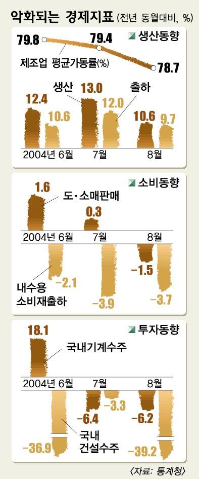 생산과 소비,투자 등 실물지표를 들여다보면 경기 하강에 대한 불안감은 더욱 커진다.7개월째 두 자릿수 성장률을 보인 산업생산과 생산자제품출하 증가율이 둔화된 가운데 제조업 평균 공장가동률(78.7%)마저 지난해 8월(77.2%) 이후 1년 만에 최저치다.소비와 투자의 척도인 도소매 판매와 기계·건설수주 실적은 더욱 악화일로다.특히 소비동향을 나타내는 소매부문에서는 백화점 판매가 전월의 2배가 넘는 13.0%의 감소율을 기록했고,대형할인점 판매도 전월(8.1%)보다 급감해 0.4% 증가에 그쳤다.통계청측은 “지난해 9월 초였던 추석연휴가 올해 9월 말로 이동하면서 올 8월에 추석특수를 누리지 못한 탓”이라고 분석했다.