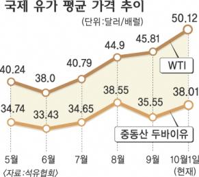 국제유가가 다시 뜀박질하고 있지만 종전과 달리 WTI의 상승세가 유난히 두드러지고 있다.이날 석유협회에 따르면 WTI의 지난 8월 배럴당 평균 가격은 44.90달러,지난달에는 45.81달러로 연속 상승한 반면 중동산 두바이유는 지난달 35.55달러로 지난 8월(38.55달러)보다 가격이 떨어졌다.