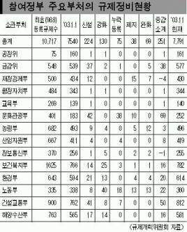7일 열린우리당 채수찬 의원이 밝힌 규제개혁위원회 자료에 따르면 참여정부 들어 정부부처별 규제정비 현황에서 출범 초기인 지난해 1월 7540건이었던 것이 11월에는 7791개로 늘어났다.이 중 신설된 규제는 224건이고 강화된 규제는 130건이다.반면 폐지된 규제는 38건이고 완화된 규제는 69건에 불과해 정부의 행정규제는 지속적으로 증가한 것으로 밝혀졌다.