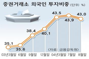 현재 증권거래소와 코스닥에서 외국인들의 주식보유 규모는 올 8월 말 현재 164조 4891억원으로 전체(398조 4101억원)의 41.3%에 이른다.거래소는 43.0%,코스닥은 20.3% 수준이다.지난해 초만 해도 30%대 중반에 그쳤던 것을 감안하면 폭발적인 증가세다.
