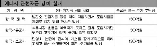 국내 주요 에너지 공기업들이 해외에서 발전자금 및 석유, 가스 등을 도입하는 과정에서 시장예측을 잘못하거나 주먹구구식으로 자금을 운영하는 바람에 수천억원씩 낭비한 것으로 나타났다. 공기업의 손실은 에너지 요금의 인상으로 이어질 가능성이 높아 국민의 추가 부담만 늘어나게 되는 셈이다.