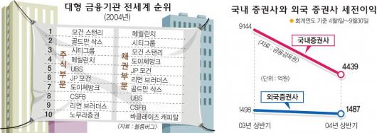 국내 증권사의 위기는 외국사와 국내사의 올 회계연도 상반기(4∼9월) 실적에서 단적으로 드러난다.17일 금융감독원 잠정집계에 따르면 국내 증권사는 올 상반기 세전(稅前)이익이 4439억원으로 전년 동기 9144억원에 비해 51.5%가 줄었다.