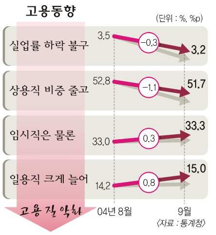 월급쟁이 직장인 가운데 상용근로자 비중은 줄고(52.8%→51.7%), 임시근로자(33.0%→33.3%)와 일용근로자(14.2%→15.0%) 비중이 크게 늘어난 데서도 극명하게 드러난다. 일용직 근로자 수는 225만 4000명으로 2002년 12월 이후 21개월만에 최고치다.