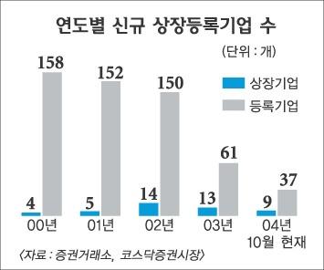올 들어 지금까지 거래소나 코스닥에 상장·등록된 기업은 46개에 불과해 예년에 비해 큰 폭의 감소세를 보였다. 연말까지 계획된 곳도 많지 않아 올해 신규 공개기업의 수는 2002년 164개, 지난해 74개에 크게 못미칠 전망이다.