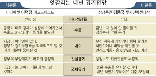 우리 경제에 대한 향후 전망을 놓고 전문가들 사이에 의견이 크게 엇갈리고 있다. 어려운 사정이 당장 빠르게 호전되기 힘들다는 데에는 의견이 모아지지만 중장기적으로 어떤 모양새를 그려가게 될지에 대해서는 낙관과 비관이 엇갈린다. 사정이 이렇다 보니 거시경제 움직임과 무관할 수 없는 개별기업 실적에 대해서도 전망이 중구난방이다.