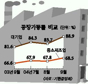 반면 전국 30개 산업단지공단에 입주한 기업을 조사한 결과에 따르면 종업원 300명 이상인 대기업의 가동률은 8월 83.7%에서 9월엔 88.9%까지 치솟았다.80% 이상을 정상 가동으로 간주하는 공장가동률에서 대기업은 지난해 2월에도 82.2%를 유지했다.