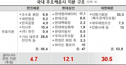 이에 비해 대주주들의 지분율은 높지 않다. 한진해운은 친인척 지분이 28.6%이고, 대한해운은 33.3%선이다. 경영권 분쟁을 겪은 현대상선은 현정은 회장 친인척 등 우호지분이 37%선으로 상대적으로 안정된 상태다.
