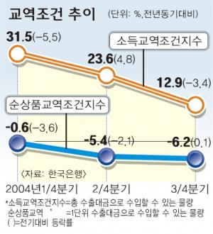 한국은행이 12일 발표한 ‘3·4분기중 무역지수 및 교역조건 동향’에 따르면 순상품교역조건지수(2000년=100)는 84.8로 전분기에 비해 0.1% 상승했다. 그러나 이는 역대 최저치였던 전분기의 84.7과 비교해 미미한 상승률을 보인 것으로 사실상 보합 수준으로 간주된다.