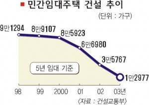 이 때문에 민간 임대주택 건설은 5년 임대를 기준으로 98년 9만 1294가구,2000년 8만 5923가구,2002년 3만 5767가구, 지난해 1만 2977가구 등으로 급격히 줄어들었다.