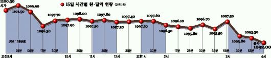 1097∼1098원에서 등락을 거듭하던 환율은 오후 장에 들어 외환당국의 개입에 대한 기대감이 사라지면서 낙폭이 확대돼 2시35분쯤 1095.50원까지 하락했다. 그러나 이날 이헌재 부총리의 환율 관련 대정부 질의 답변이 구두개입으로 알려지면서 2시56분쯤 1097원대를 회복하기도 했다. 그러나 이 부총리의 발언이 개입 차원은 아닌 것으로 해석되자 오히려 실망한 매도물량이 쏟아져 3시쯤 1095원대로 되밀린 뒤 결국 낙폭을 키워 이날 최저가인 1092원으로 장을 마쳤다.