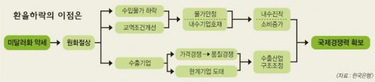 삼성경제연구소 김경원 상무도 “환율하락은 우리 기업들이 겪고 넘어가야 할 과정”이라면서 “다만 재작년부터 서서히 환율하락에 대비했더라면 충격은 지금보다는 덜했을 것”이라고 말했다. 특히 환율하락이 내수진작에 도움이 된다고 보는 사람들은 그동안 수출을 위해 환율을 떠받쳐온 것은 거품이라고 주장한다.