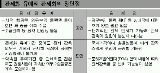 관세화를 택할 경우 쌀 시장을 완전개방하는 대신 관세화 유예(현행 5%) 방식에 비해 훨씬 높은 관세율을 적용하게 된다. 관건은 얼마나 무거운 관세를 물게 해 국내 쌀산업의 피해를 줄이느냐 여부다. 관세화 유예는 시장 완전개방 시기를 더 미루는 대신 유예기간을 얼마나 늘리고 의무적으로 수입해야 하는 쌀을 되도록 얼마나 적게 들여오느냐가 중요한 문제다. 이처럼 여러가지 경우의 수가 있기 때문에 두 가지 대안의 이해득실을 따지기가 쉽지 않다.