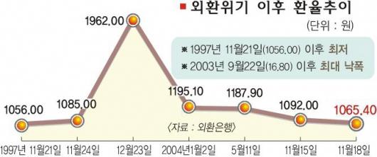 원·달러 환율은 지난 15일 1100원이 붕괴되는 등 이번주 들어 불과 나흘 만에 40원 가까이 폭락했다. 연초에 비해서는 129.60원이나 떨어졌다. 이날 종가는 97년 11월21일 1056.00원 이후 7년 만에 가장 낮은 수준이다. 하루 낙폭도 지난해 9월22일의 16.80원 하락 이후 가장 컸다.
