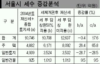세제개편으로 재산세가 인상되는 가구는 서울시내 전체의 59.9%인 173만가구나 된다. 이 가운데 100% 이상 인상은 23%인 54만가구에 이른다. 인상률로 보면 100∼200% 39만가구(16.8%),200% 이상 15만가구로 나타났다.400% 이상 오르는 경우도 3119가구였다.